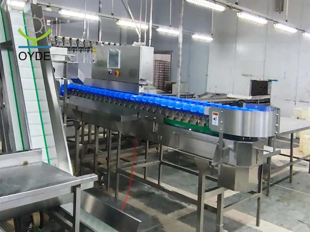A box-type grading scale utilizes two sprockets to drive the rotation of fixed boxes on a chain. it employs weight sensors to initially weigh each individual box, calculating the weight of the materials within each box Then, through a diverting unit, it directs the respective box into the corresponding weight category based on the data.